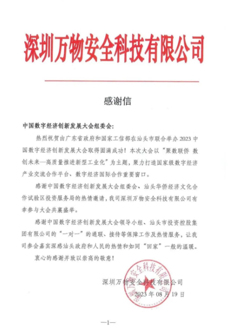 8月19日,萬(wàn)物安全公司發(fā)來(lái)感謝信,對(duì)中國(guó)數(shù)字經(jīng)濟(jì)創(chuàng)新發(fā)展大會(huì)組委會(huì)精心安排和汕投控集團(tuán)熱情周到的接待表示由衷的感謝。