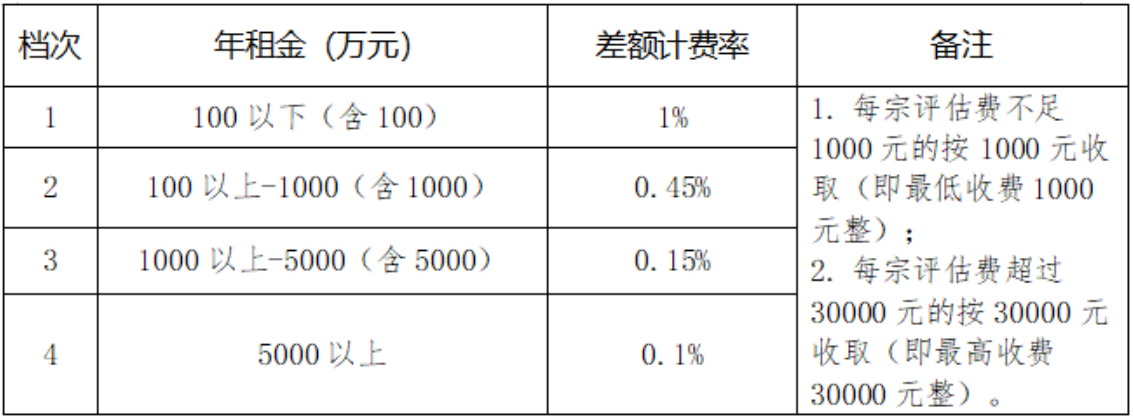 (一)物業(yè)出租/出借收費(fèi)標(biāo)準(zhǔn)。評估機(jī)構(gòu)收費(fèi)須以每宗出租/出借物業(yè)年租金評估值,參照《廣東省物價局關(guān)于資產(chǎn)評估收費(fèi)有關(guān)通知》,按以下標(biāo)準(zhǔn)分段累計: