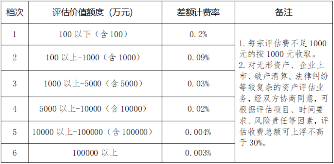 (二)轉(zhuǎn)讓、抵押等其他評估情形收費(fèi)標(biāo)準(zhǔn)。評估機(jī)構(gòu)收費(fèi)參照《廣東省物價局關(guān)于資產(chǎn)評估收費(fèi)有關(guān)通知》中“計件收費(fèi)標(biāo)準(zhǔn)”按20%折扣計費(fèi),即按以下標(biāo)準(zhǔn)分段累計: