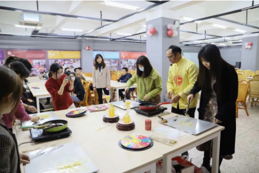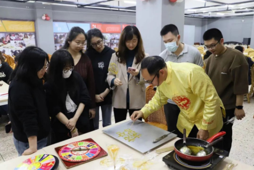 百師園內(nèi),三千件國(guó)家級(jí)、省級(jí)非遺大師精品琳瑯滿目地陳列在我們眼前,讓人嘆為觀止,目不暇接。團(tuán)干青年們跟隨王壽權(quán)老師近距離學(xué)習(xí)和體驗(yàn)糖畫這一非遺文化技藝,近距離感受工匠精神和深厚的文化底蘊(yùn)。以糖漿為墨,以長(zhǎng)勺代筆,將心意揮灑在光潔的案板上,提、頓、放、收,或一筆帶過(guò)或一氣呵成,以獨(dú)特的風(fēng)格體驗(yàn),收獲“美”與“食”的藝術(shù)享受。
