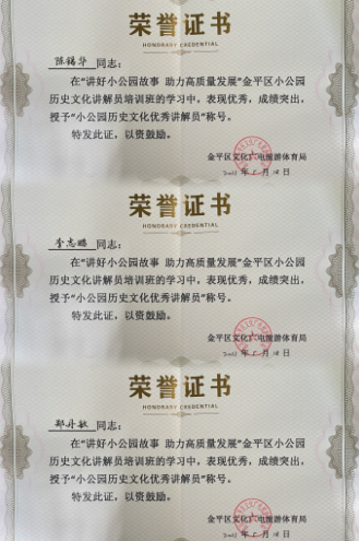 據(jù)了解,今年5月,投控國(guó)旅公司導(dǎo)游、講解員陳錫華、李志鵬、鄭丹敏三人還榮獲金平區(qū)文化廣電旅游體育局頒發(fā)的“小公園歷史文化優(yōu)秀講解員”稱(chēng)號(hào)。